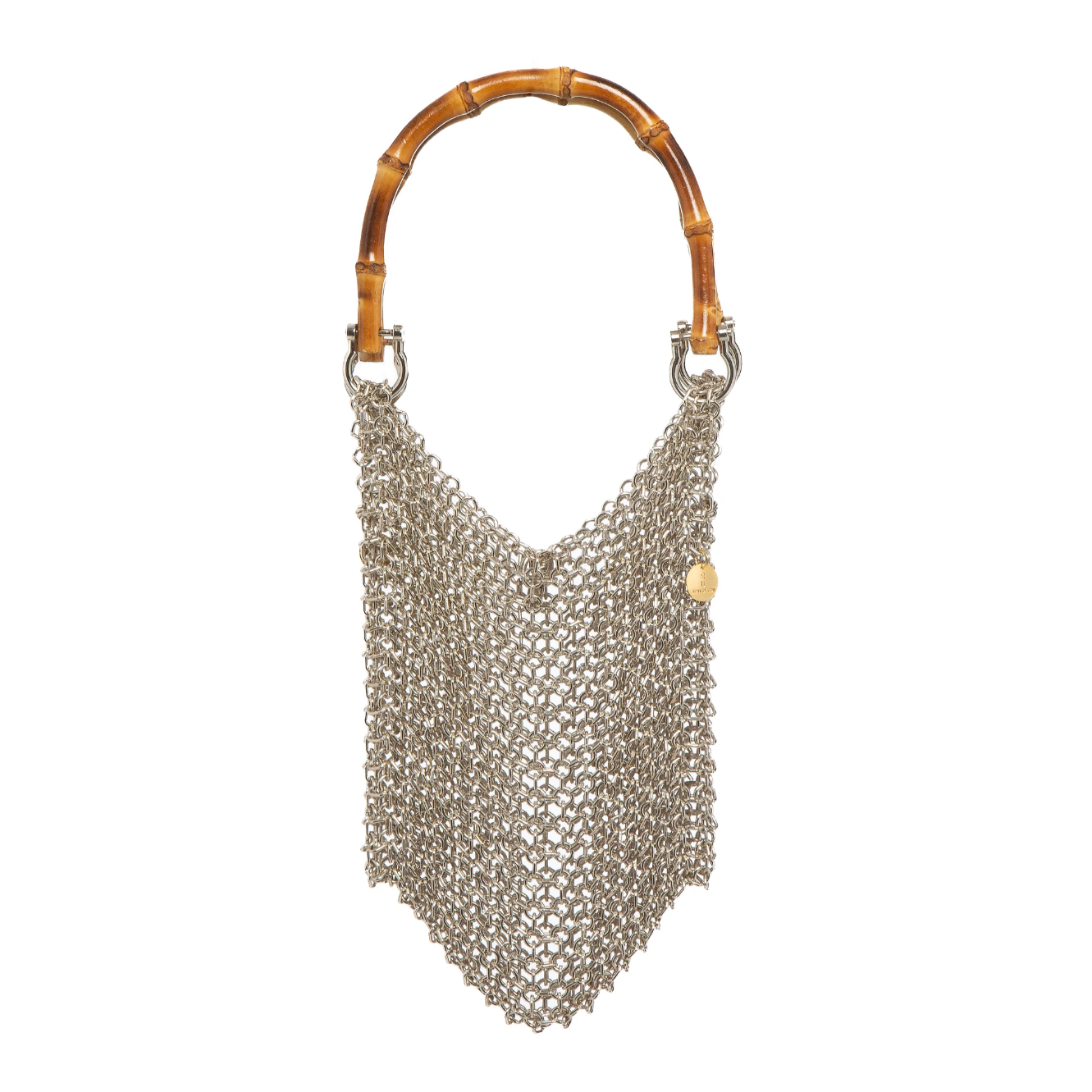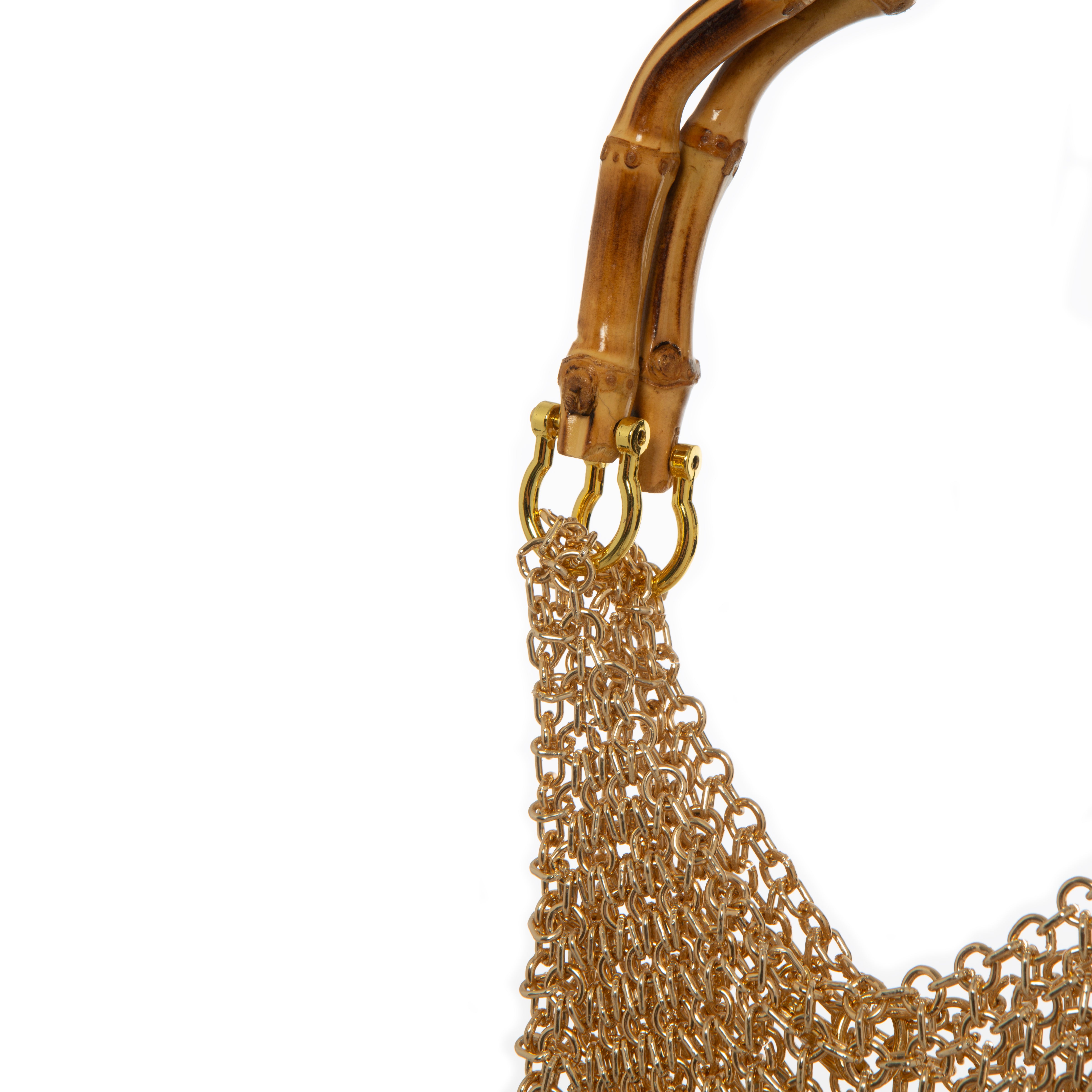 Made in Italy. This handmade chainmail bag features smooth bamboo handles and is crafted by skilled artisans using premium materials. Its fluid silhouette is formed from interlinked metal chains that shimmer with every step—designed to catch the light and all the attention.